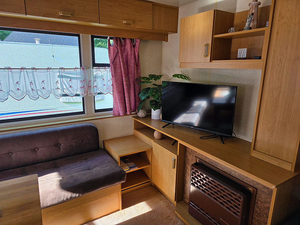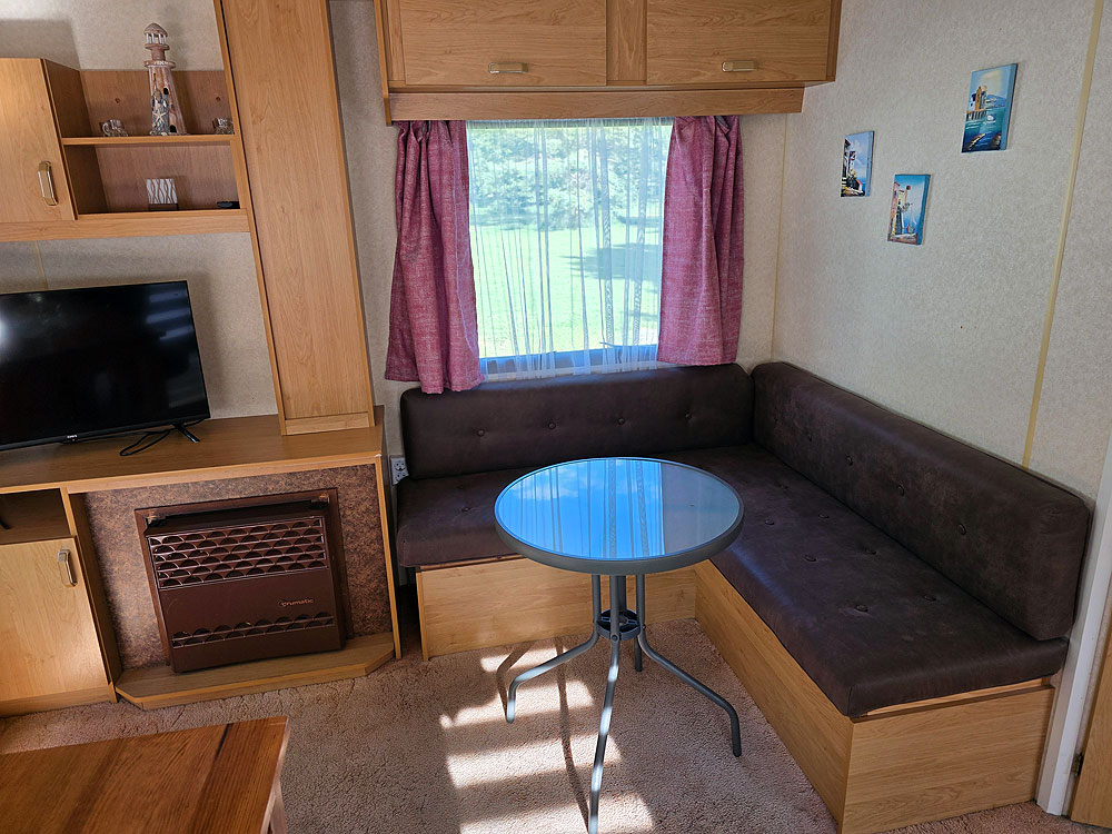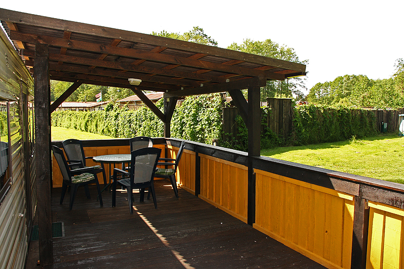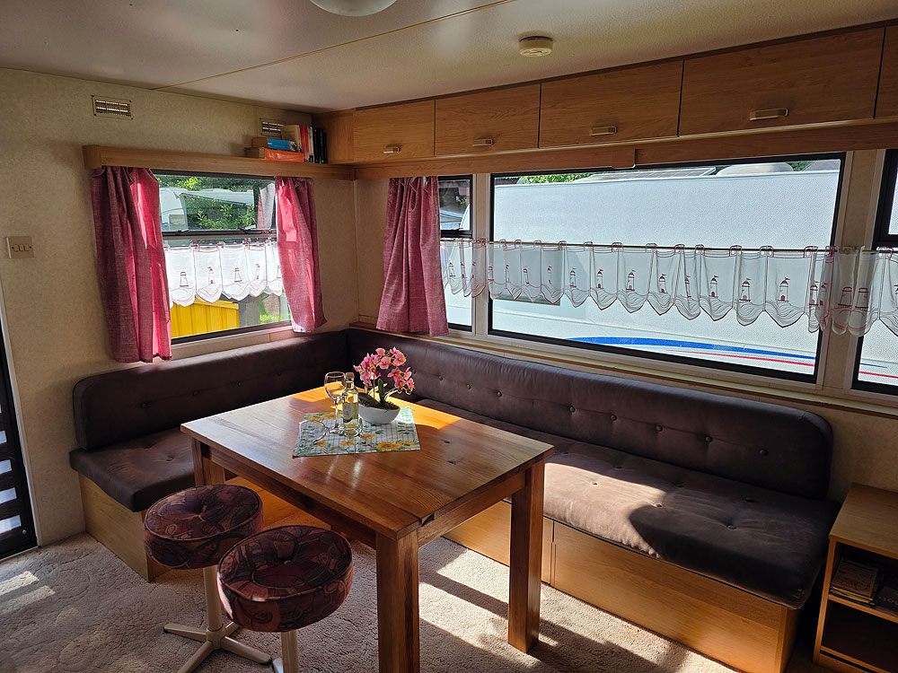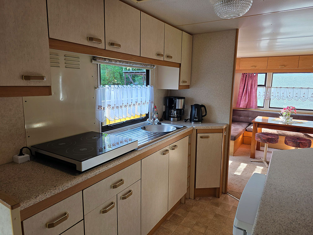 4 Schlafmöglichkeiten – Überdachte Terrasse mit Bänken und Tisch – Küche mit 2-Plattenherd – Geschirr – Besteck – Gläser – Pfannen – Töpfe – Kaffeemaschine – Sat-TV – Kühlschrank – WLAN außen